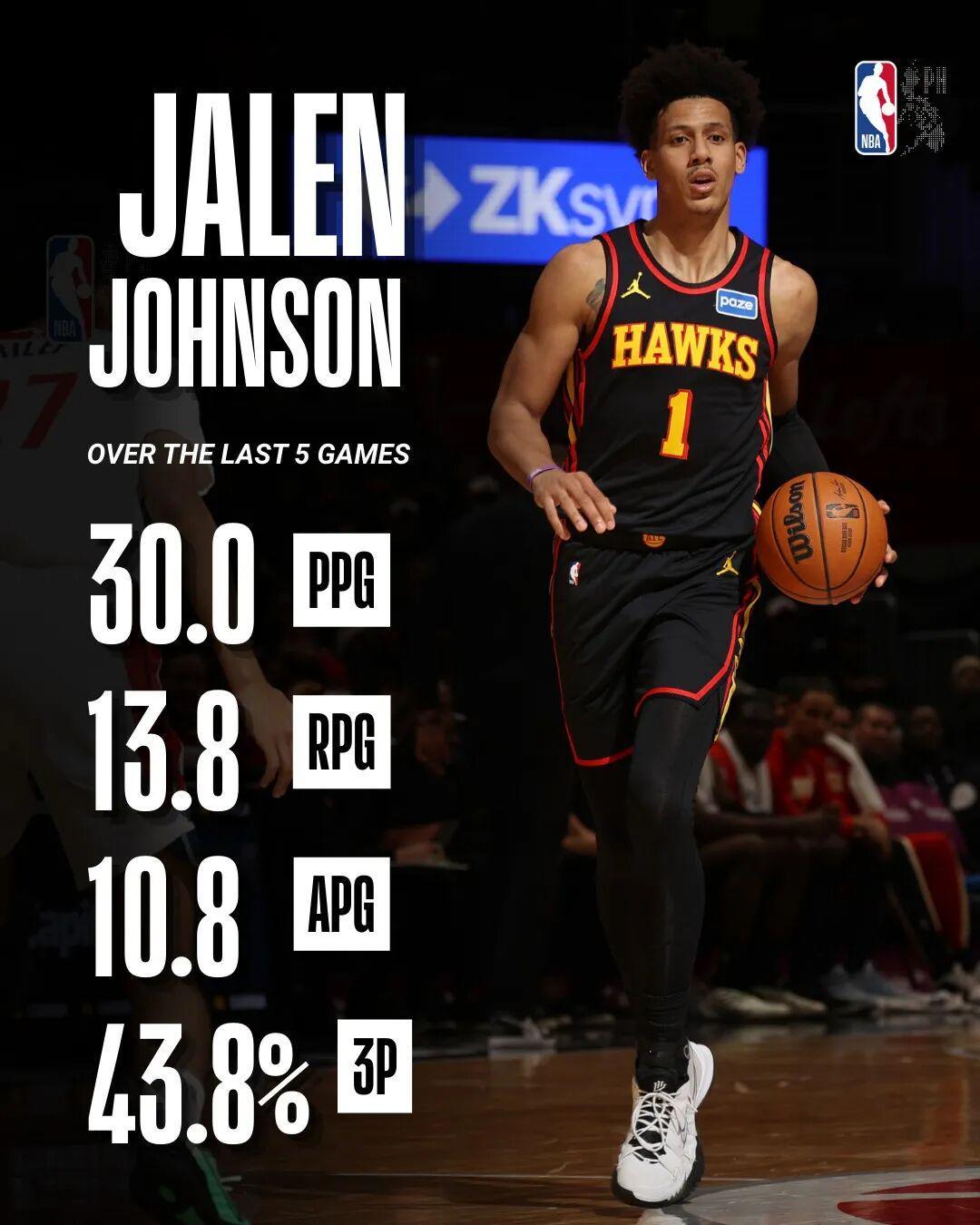 这两场比赛过后,老鹰在官方晒图感叹道:过去24小时的杰伦约翰逊,51分30篮板28助攻,天呐(Sheesh)。